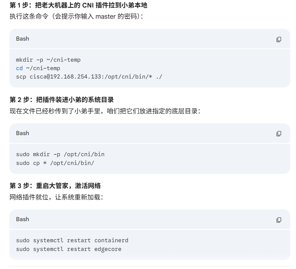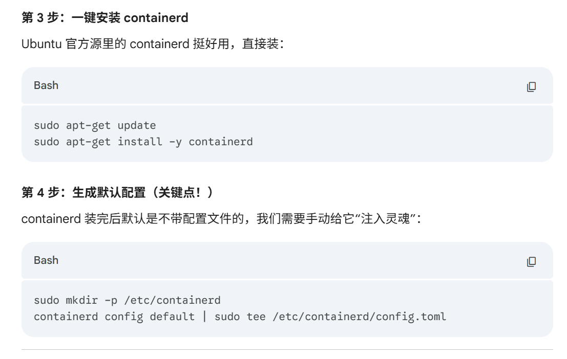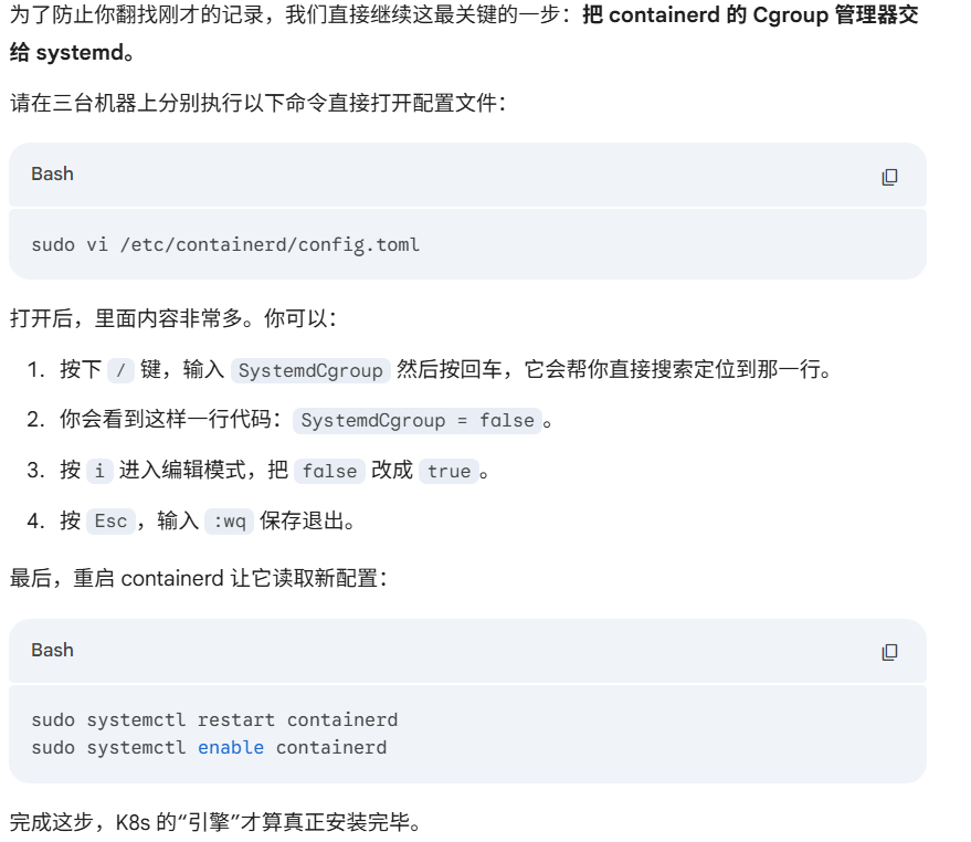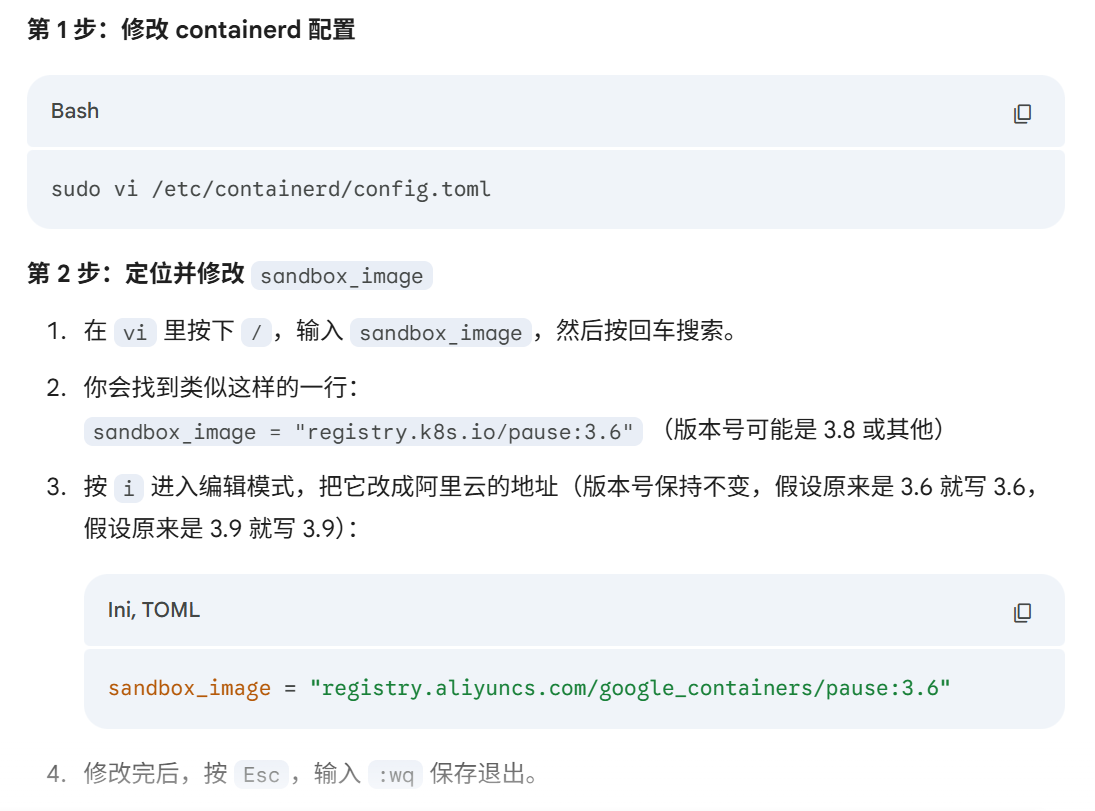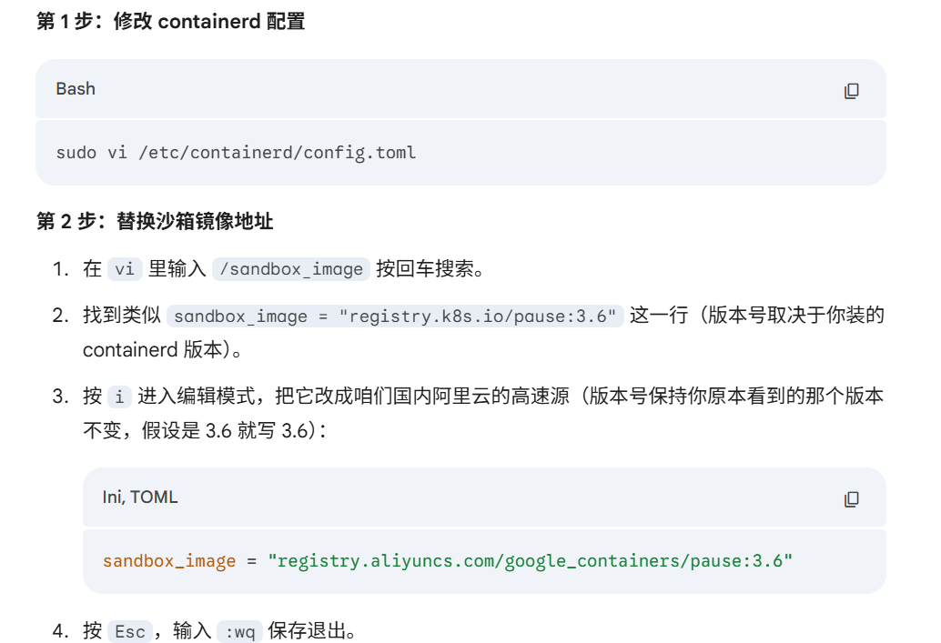 在执行第二步时出现问题,containerd 的配置文件里,写死了去国外的 registry.k8s.io 去拉取 pause 镜像,需要强行把 containerd 配置文件里的那个“国外地址”改成“阿里云地址”: