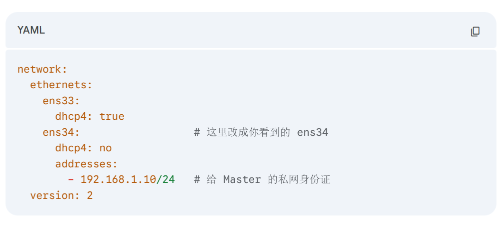 打开配置文件:sudo vi /etc/netplan/00-installer-config.yaml
