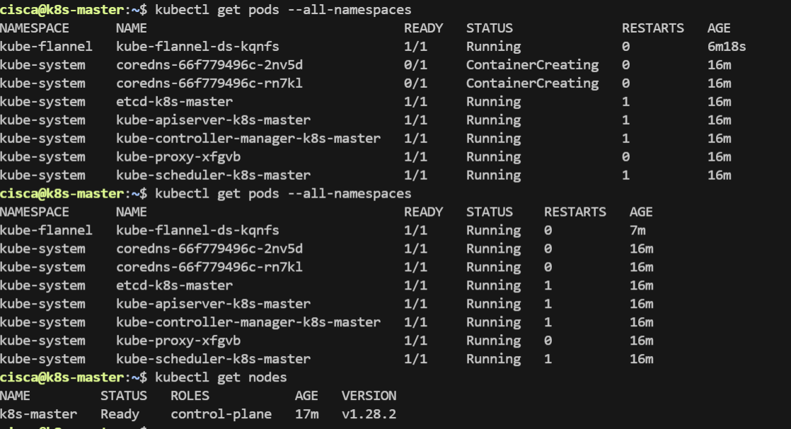 注意,安装插件时需要等待一段时间,可以用kubectl get pods --all-namespaces命令查看目前状态:
